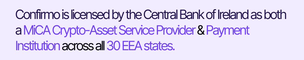 These authorisations establish Confirmo Limited as the fully regulated operational hub for the company's European business. Under EEA passporting rules, a single authorisation from the CBI grants Confirmo the right to offer its crypto and payment services across all 27 EU member states - giving global enterprises and financial institutions a compliant partner for cross-border stablecoin payments at scale.